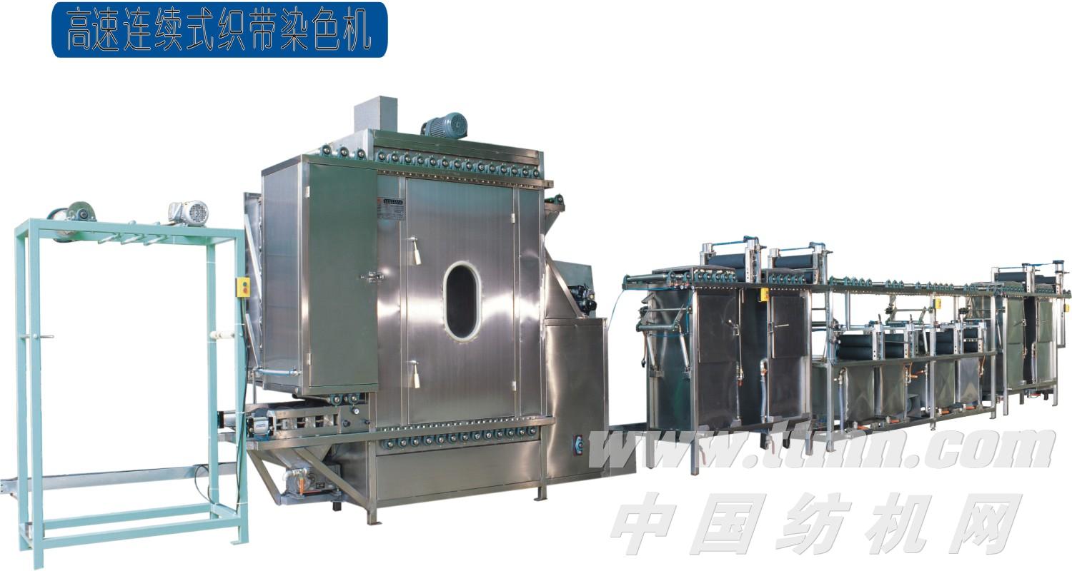 3、本機型為高效率織帶染色機:由放帶裝置->染缸->紅外預熱->高低溫固色->前延伸->后延伸固色箱->密封箱清洗->燙干定型箱->收帶