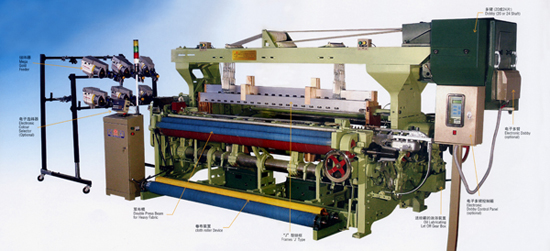 送徑: 半積極外側式機械送徑,備有三后梁經紗漲力控制機構,經軸盤片直徑φ550或φ400毫米。