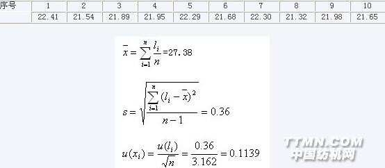 1.4不確定度來源 1)重復性測試引起的不確定度 2) 環境溫濕度的影響所引起的不確定度 3) 標準物質校準引起的不確定度1.5不確定度分量的評定 1.5.1測試過程隨機效應導致的不確定度 對同一個棉花樣品的10個試驗試樣進行測試,測定的上半部平均長度值如表1。表1 上半部平均長度測試結果