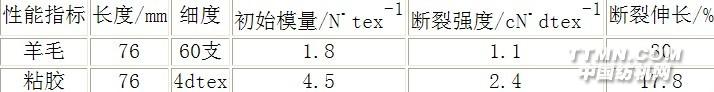 2 實(shí)驗(yàn)2.1 實(shí)驗(yàn)用原料(見(jiàn)表1)表1 羊毛、粘膠的物理指標(biāo)
