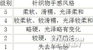 2.2 織物設(shè)計(jì) 用羊毛與粘膠以不同混紡比按精紡工藝流程紡成毛紗及混紡毛紗,再并捻成為雙股線,股線支數(shù)為20.83×2tex(48/2Nm),股線拈度為202捻/m,在橫機(jī)上織成緯平組織的針織物,線圈密度為:縱向——76圈/10cm,橫向——56圈/10cm。2.3 測(cè)試方法2.3.1 起毛起球的測(cè)試 試樣在YG502型織物起毛起球儀上測(cè)試,測(cè)試結(jié)果見(jiàn)圖1。2.3.2 手感風(fēng)格的測(cè)定 通過(guò)目測(cè)手摸等方式對(duì)試樣的硬挺度、光滑性、光澤等進(jìn)行綜合感觀評(píng)定織物手感風(fēng)格后,將純毛織物試樣的手感風(fēng)格值定義為5級(jí),評(píng)定標(biāo)準(zhǔn)見(jiàn)表2,測(cè)定結(jié)果見(jiàn)圖2。表2 針織物