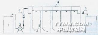 圖1 ABR試驗(yàn)裝置示意 1-進(jìn)水桶;2-迸水泵;3-玻璃轉(zhuǎn)子流量計(jì);4-ABR反應(yīng)器;5-排泥口;6-閥門;7-排水桶 厭氧折流式反應(yīng)器的有效容積為7.2 m3,分為5個(gè)隔室。設(shè)計(jì)處理水量為0.2~0.5 m3/h,水力停留時(shí)問(HRT)可控制在14~36 h。每室由一個(gè)下流室和一個(gè)上流室組成,上流室與下流室的寬度比為4:1。通往上流室的擋板下部邊緣有45°倒角的導(dǎo)流板布水,便于將水送至上流室的中心,使泥水充分混合,維持較高的污泥濃度。每室頂部設(shè)有取樣口,進(jìn)水從進(jìn)水箱由進(jìn)水泵打入ABR反應(yīng)器中,通過調(diào)節(jié)流量計(jì)來保證系統(tǒng)進(jìn)水的恒定。1.2試驗(yàn)水質(zhì) 處理水質(zhì)取自江蘇省常熟市梅李污水處理有限公司調(diào)節(jié)池。該公司污水處理設(shè)計(jì)能力為
