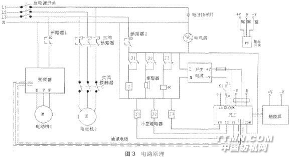 2控制系統電路及工作原理 控制系統電路的核心器件為觸摸屏、可編程控制 器、變頻器,其電路原理如圖3所示。