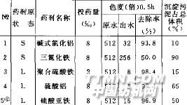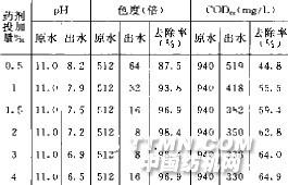 2 試驗(yàn)部分2.1 廢水水質(zhì)選用硫化染料、還原染料、直接染料、活性染料、陽(yáng)離子染料的染色廢水進(jìn)行試驗(yàn)。水質(zhì)隨產(chǎn)品以及染料的變化波動(dòng)較大,廢水水質(zhì)一般為pH8.5~11.5,色度128~2048倍,CODcr:31O~ 980mg/L。2.2 混凝劑選用市售的五種混凝劑,對(duì)固體混凝劑進(jìn)行水溶,對(duì)液體混凝劑進(jìn)行稀釋?zhuān)褂靡旱牟蓝葹?~5度。2.3 試驗(yàn)方法取250ml的染色廢水,加入一定量的混凝劑,攪拌均勻,靜置使其析出沉淀.澄清液即為處理后的出水,測(cè)澄清液的pH,色度CODcr。