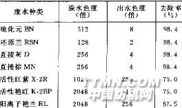 注:處理時(shí)間為0.5h表3結(jié)果表明,對(duì)七種染料廢水都具有脫色處理效果,其中以硫化染料、直接染料、還原染料的染色廢水