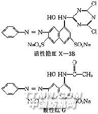 1 染色原理 活性染料水解后的母體結構與酸性染料非常相似,如活性艷紅X—3B和酸性紅G的結構如下: