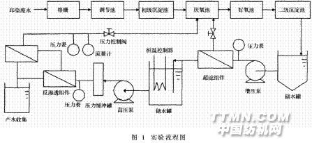 印染廢水具有高COD、高色度、高鹽度等特點, 傳統的處理技術已經較難達到排放要求[1]。生物 法是目前處理印染廢水應用最廣泛的技術之一,隨 著使用染料種類的增加,分子結構復雜且穩定,使得 印染廢水可生化性較差,加大了廢水處理的難 度[2, 3]。印染廢水其他處理方法主要有Fentons試 劑、臭氧、電化學降解和絮凝沉淀等,國內外很多人 在這方面進行了深入研究,相關結論及優缺點的比 較在文獻中有報道[4, 5]。 印染行業用水量大,隨著水資源日益短缺和水 費不斷上漲,廢水回用技術勢必逐步推廣,膜技術的 應用將越來越廣泛。雙膜技術是目前國際上研發和 工程化應用的熱點之一。作為一種有效的工程預處 理手段,超濾可去除廢水中大部分濁度和有機物,從 而能減輕反滲透膜的污染,延長膜的使用壽命,減少 膜工程的運行成本。反滲透膜不僅能有效去除有機 物、降低COD,而且具有優秀的脫鹽效果。由于 COD脫除、脫色、脫鹽能在一步完成[6],其出水品質 高,能直接回用于印染環節,同時濃水可回流至常 規工序處理,實現廢水零排放和清潔生產。