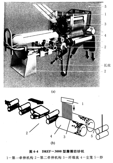 圖6—4為DREF一3000型摩擦紡紗機,它與DREF-2000型的加捻機構相似(尺寸規格不同),但在成紗原理上有本質的區別,屬于非自由端紡紗。它由兩個纖維供應區組成,第一個區與DREF-2000型相似,由三對牽伸羅拉和分梳輥組成,條子經牽伸、分梳成單纖維后,由輸送管道垂直地送到兩塵籠組成的楔形區;第二區為四羅拉雙皮圈牽伸機構,經牽伸的須條加捻成