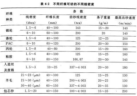 2)適紡線密度上述不同纖維可紡的不同線密度示于表6—2中。