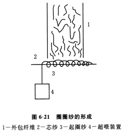 結(jié)子紗使紗線上呈現(xiàn)不均勻分布的小結(jié)子,圈圈紗則有大大小小的毛圈。只要在摩擦紡紗機(jī)上,使用一個(gè)大于出紗速度的超喂裝置就可生產(chǎn)此種紗線。它由芯紗、外包纖維和起圈紗三部份組成。芯紗和外包纖維的喂給在原摩擦紡紗機(jī)上進(jìn)行,起圈紗則另由超喂裝置供給,超喂速度高出紡紗速度20%~60%。超喂速度高出20%,外包纖維和起圈紗的比例為70:30,能紡出結(jié)子紗;超喂速度高于60%,則紡出圈圈紗。不同超喂速度得到不同形式的花色紗,圖6—21為圈圈紗形成的示意圖。