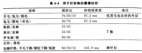 表6—4所示為用于針織物的摩擦紗。利用摩擦紗的分層結(jié)構(gòu)特點(diǎn),紡制不同結(jié)構(gòu)的針織用紗,如優(yōu)質(zhì)毛位于外層的針織毛紗。外層捻度低,有利于后整理縮毛面積,絨面豐滿蓬松,保暖性好。
