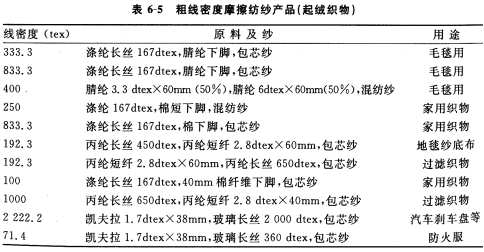 利用摩擦紡紗的結(jié)構(gòu)分層特點(diǎn)、內(nèi)緊外松、捻度內(nèi)多外少、蓬松,具有良好的起絨效果,起絨織物保暖,手感豐厚、柔軟,彈性好。紗體中纖維平行度差而更富有毛絨感。表6—5列出各種纖維紡制的特粗線密度的摩擦紡產(chǎn)品,多數(shù)可制作起絨織物。