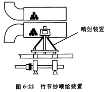 在摩擦紡機(jī)上加配一個(gè)紡竹節(jié)紗機(jī)構(gòu),它可以向楔形凝聚區(qū)間歇地噴射纖維,在紗中形成有規(guī)律或無規(guī)律的竹節(jié),即竹節(jié)紗,還可以噴射彩色纖維,形成彩色竹節(jié)紗。如圖6—22所示。