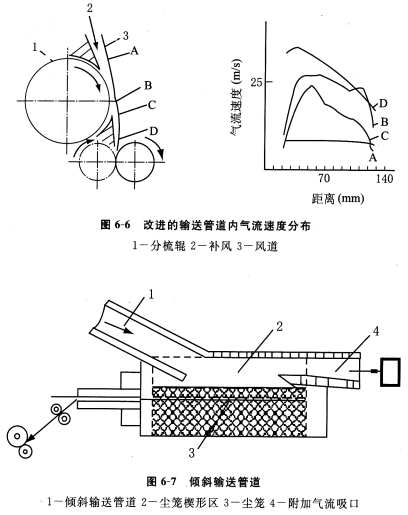 通過測定纖維輸送管道內氣流速度分布可以看出(如圖6—5所示):氣流速度自輸送管道人口至出口是減速的,這對纖維伸直不利。C處的氣流速度分布沿’紗軸方向接近均勻,可為均勻添加纖維到紗尾創造條件。因此,輸送管道的設計應盡量使氣流運動均勻分布且處于加速流動,有利于纖維伸直和添加到紗尾上。圖6—6為改進的管道氣流分布。