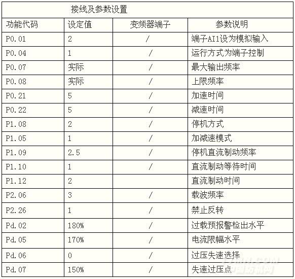 在大圓機運轉(zhuǎn)中,絕對不能讓電機反轉(zhuǎn)以及回轉(zhuǎn)現(xiàn)象,否則針床的針將被折彎甚至斷針。有些大圓機接入單向軸承,可不予考慮。要是系統(tǒng)正反轉(zhuǎn)完全取決于電機的正反轉(zhuǎn)控制,則需要設置合理的參數(shù),一方面要設置禁止反轉(zhuǎn)功能,另外一方面需要直流制動功能。還要注意不能出現(xiàn)失速現(xiàn)象,以免造成斷針等損失。本方案采用模擬量輸入給定頻率。線路簡單(省略)大圓機要求起動時響應要快,低頻大轉(zhuǎn)矩輸出;停機時要光滑、柔和一些,以保護針床。因此合理設置上表參數(shù)是充分發(fā)揮圓機性能的保證,原則是通過調(diào)解P0.19,P9.00參數(shù)得到最佳的低頻轉(zhuǎn)矩輸出能力以及降低圓機高速運行的振動,通過調(diào)起停控制(P1組)以及加減速度時間參數(shù)(P0組)得到頻率調(diào)節(jié)的光滑性。
