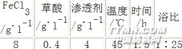處理步驟:按表1將滲透劑、草酸溶于水中,加入已配好的三氯化鐵,攪勻后溫度控制在45℃,投入純毛花呢布樣,浸泡1.5h取出,用軋車軋去液體(軋余率80%),在pH3~4的水溶液中浸5min(溶比1∶25)洗成中性,然后按表2處理。