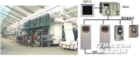 1. 引言 絲光工序是將煮練過的平幅織物在一定張力下,用濃堿溶液處理,使織物纖維發生不可逆的溶脹,纖維截面趨向圓形,表面光滑,再經沖洗去堿、蒸洗去凈等加工,使織物產生絲一樣的光澤,從而使織物獲得穩定的尺寸、耐久的光澤、增加抗拉強度并提高對染料的吸附力。 絲光工藝使用的絲光機有布鋏絲光機、直輥絲光機、彎輥絲光機等,其中應用比較普遍的是布鋏絲光機,是由左、右兩組布鋏鏈條組成,織物在布鋏夾持下進行沖洗去堿擴幅,幅寬容易控制,使織物獲得較好的縮水率。 高速布鋏絲光聯合機和其它染整機械一樣由進布裝置、扎車、繃布輥、布鋏式拉幅機(絲光機)、水洗機、烘燥機、出布裝置等眾多通用裝置和單元機組成。其控制系統采用多單元交流變頻調速,調幅、吸堿、噴淋、堿液回收用交流電機傳動,探邊、水洗機、上排導布輥用力矩電機傳動,控制核心是對絲光機左、右兩組布鋏鏈獨立傳動,在速度跟隨的同時實現位置同步,要求運轉布速可達100m/min以上。整個系統采用10.4” Magelis XBT-G 彩色TFT觸摸屏(XBT G5330)進行參數設定、顯示等操作和系統監控。