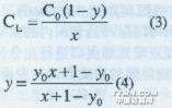 式中,CL為洗滌液中洗除物的濃度,g/mL;C0為洗滌前織物上洗除物的濃度,g/mL;y0為在同一條件下,采用完全不含洗除物的洗滌液洗滌時,洗除物殘留率。 該式是假定洗滌前后織物中的水分不變,纖維不對洗除物選擇性吸收的情況下的公式,同實驗結果非常一致。 假如使用的洗滌水為織物中所含水分的X倍,由于物質均衡,式(3)便成立,且由式(2)和式(3),可以導出式(9):