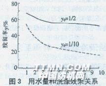 圖3表示洗滌液中,洗除物濃度為零時殘留率為1/2和1/10兩種情況,由式(4)計算得出的洗滌,水量同洗除物殘留率的關系。 洗滌效果不良的機器(yo=1/2),即使增加用水量,洗滌效果提高也不顯著。在這種情況下,常常用提高洗滌溫度或延長洗滌時間等方法來提高洗滌效果,而用減少洗滌水量來達到節能的目的。