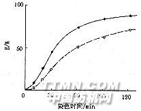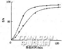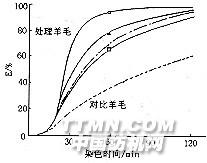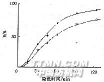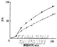(b)31.25×2tex 針織紗—●—處理羊毛;—○—對比羊毛圖8 5mmol/L NaOH 50℃處理30min的不同品種毛紗用相同染料60℃染色的E曲線 由以上各種試驗的結果,堿前處理可以提高羊毛染色的上染率的結論是無疑的。考慮到長時間堿處理對羊毛物性的不良影響,采用NaOH濃度5~10mmol/L、溫度40~60℃,處理時間30min左右的條件為最合適的。