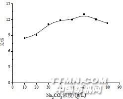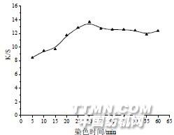 圖 3.1 預軋堿液濃度對織物染色后K/S 的影響由圖 3.1 可知,隨著Na2CO3 濃度的增加,染色織物的K/S 值隨著濃度的增加而增加,當濃度增加到40g/L 后,K/S 值增加緩慢,因此從控制堿用量出發,固色用堿劑Na2CO3 的濃度確定在40g/L 較為合理。在本實驗的D5 反膠束染色時,固色堿是預先浸軋在織物上的,織物帶堿量有限,由于在染料反應的過程中不斷有H+生成,中和了固色堿,從而使固色堿的用量不斷減少,固色過程中的pH 下降,導致固色效果下降。故提高Na2CO3 浸軋堿液的濃度使Na2CO3 適當過量比較有利:多余的Na2CO3 可以補充反應過程中消耗的堿,保證了反應過程中所需的pH 值,有利于固色反應順利進行。3.1.3 染色時間的優選D5 反膠束染色過程中僅有極少量的水,染液濃度遠遠高于普通水浴中的染液濃度,而且處在非極性介質的包圍中,此時的染料溶液對纖維素纖維具有很高的親和力,上染的速度很快,因此可以預期D5 反膠束的染色時間相比傳統水浴染色要短。為證實這一推測,用活性紅3BS 在相同濃度Na2CO3 作為固色劑的條件下進行了不同染色時間的實驗研究,用K/S評價染色效果,結果如圖3.2 所示。