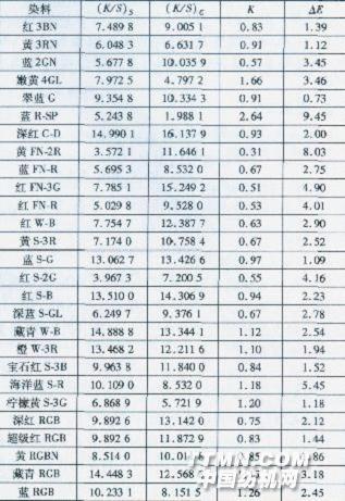 2 結果與討論2.1染料篩選 為使真絲/棉雙組分面料獲得良好的同色性,首先要選擇合適的活性染料。本試驗分別選用不同廠家的活性染料對真絲/棉交織物進行染色,通過分析其表觀深度K/S值與色差△E,篩選出同浴染色同色性較好的三原色染料。 表1 不同染料的染色同色平衡值置及色差△E