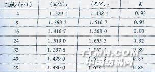 注:拼色處方見表2,染料總用量0.5%(owf),純堿27g/L。 由表3可知,隨著元明粉用量增加,真絲與棉織物的染色深度都有所提高,且同色性也提高;當元明粉用量增加至56 g/L后,同色平衡值K變化不大。綜合考慮,元明粉用量以56 g/L為宜。2.3.2純堿 表4純堿用量對真絲/棉交織物兩色性的影晌