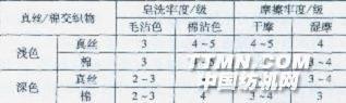 由表5可知,真絲/棉交織物染色后各項牢度較好,且保持了真絲與棉原有的風格。