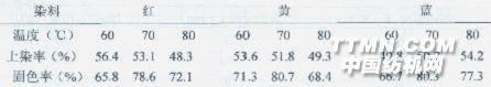 通過極值求極差,并進行對比可以得出固色階段溫度影響最大,其后是時間,最后是堿劑用量。由于溫度對上染率和固色率的影響較大,溫度高有利于染料的擴散和勻染并提高染料與纖維的反應速率,但也會加速染料的水解。為此我們做了溫度對染料上染上染率、固色率的影響實驗。 我們選用紅、黃、藍三原色活性染料進行染色。表8:溫度對染料上染率、固色率的影響